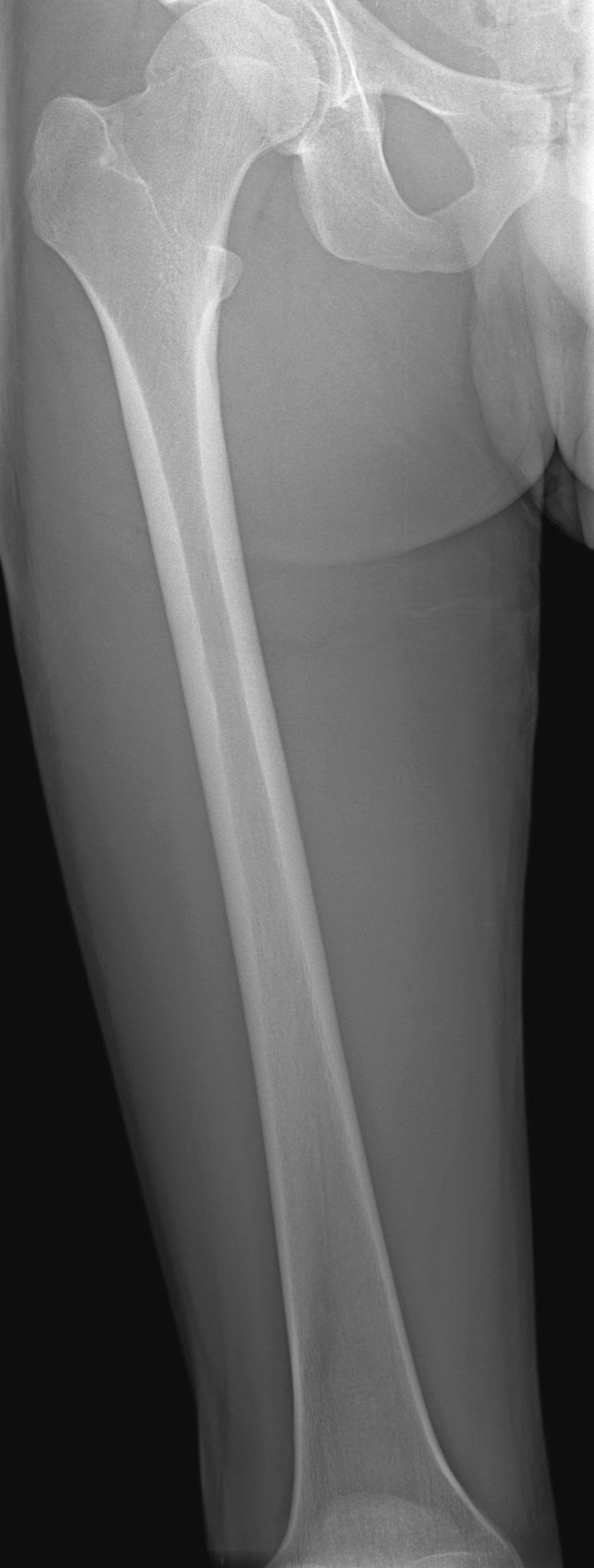 The X-ray beam is directed anteroposteriorly, perpendicular to the femur, and centered either on the midshaft or as two separate exposures (proximal and distal) if the entire femur cannot be included in one image. This view provides clear visualization of the femoral shaft, cortical bone, and adjacent joints, making it essential for detecting fractures, bone lesions, alignment abnormalities, and for postoperative follow-up in cases of femoral surgery or trauma.