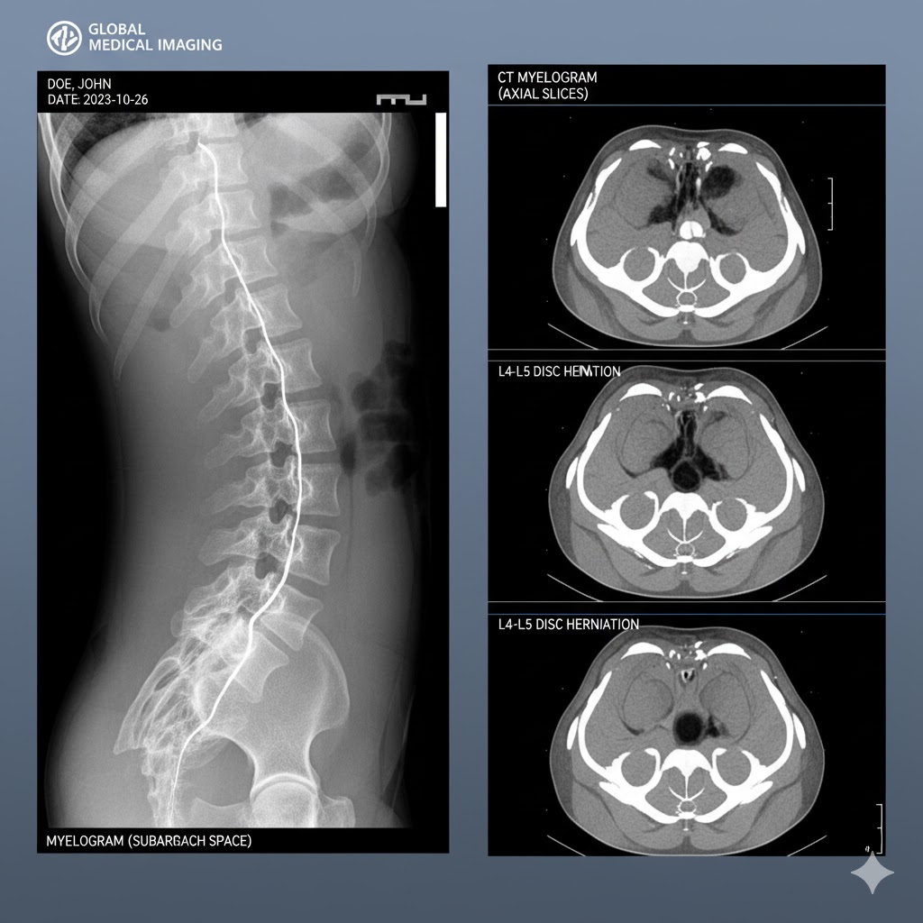 Myelogram is a specialized imaging procedure used to evaluate the spinal cord, nerve roots, and subarachnoid space by injecting a contrast dye into the cerebrospinal fluid (CSF) via a lumbar puncture. This procedure is typically followed by X-ray (fluoroscopy), CT myelography (CTM), or MRI to obtain detailed images of the spinal structures.